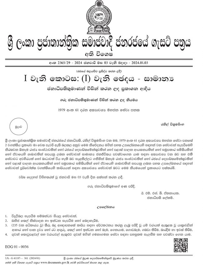අත්යවශ්ය සේවාවන් ගැන ජනපතිගෙන් හදිසි ගැසට් නිවේදනයක්