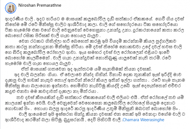 එමෙන්ම මේ වන විටත් රෝහල්ගතව සිටින චාමර ගේ නවතම තත්ත්වය පිළිබදව හිටපු පාර්ලිමේන්තු මන්ත්රී නිරෝෂන් ප්රේමරත්න සිය මුහුණු පොතට සටහනක් තිබුණෙ පහත් අයුරින්,
