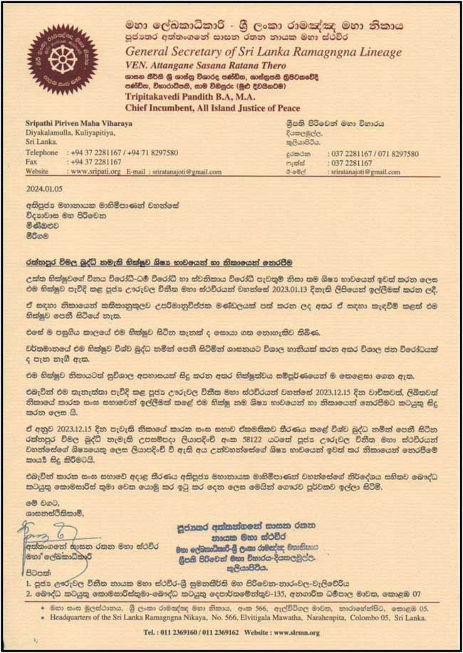 එසේම අදාළ නිවේදනයේ වැඩිදුරටත් දැක්වෙන්නේ ශාසනයට සිදුකරන ලද අති විශාල හානිය පදනම් කරගනිමින් රත්නපුරේ විමලබුද්ධි හිමි රාමඤ්ඤ නිකායෙන් නෙරපීමට තීරණය කර ඇති බවය.