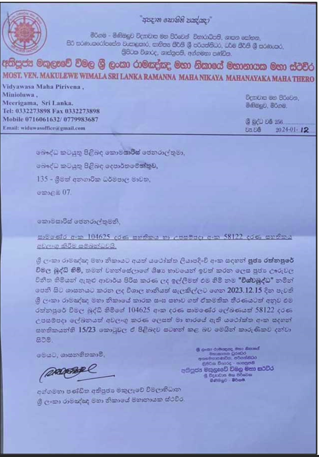 ශ්රී ලංකා රාමඤ්ඤ නිකායේ මහා නායක අති පූජ්ය මකුලෑවේ විමලාභිධාන නා හිමි විසින් මේ බව බෞද්ධ කටයුතු කොමසාරිස්වරයා වෙත දැනුම්දී තිබේ.