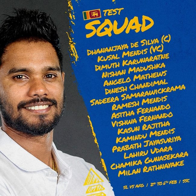 ඇන්ජලෝ මැතිව්ස්, දිනේෂ් චන්දිමාල්, දිමුත් කරුණාරත්න මෙන්ම නවක ක්‍රිඩකයින් ලෙස චාමික ගුණසේකර සහ මිලාන් රත්නායකද ඇෆ්ගනිස්ථානයට එරෙහි ටෙස්ට් තරගයට නම් කර තිබෙනවා.