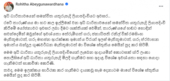 සිය ෆේස්බුක් ගිණුමේ විශේෂ සටහනක් එක්කරමින් මන්ත්රීවරයා මේ බව සඳහන් කර ඇත.