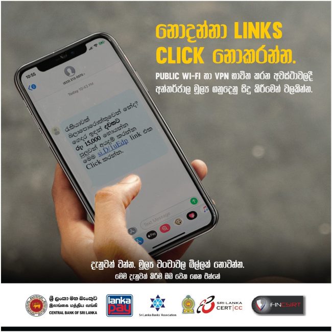 ජංගම දුරකථන පරිශීලනය කිරීමේදී තමන් නොදන්නා Links click කිරීමෙන් වළකින ලෙස ශ්රී ලංකා මහ බැංකුව ජනතාවගෙන් ඉල්ලා සිටිනවා.