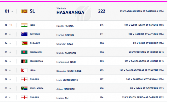 ඒ ප්රසාද ලකුණු 222ක් ලබා ගෙන ප්රථම ස්ථානයේ රැඳී සිටි ඉන්දියානු තුන් ඉරියව් ක්රීඩක hardik pandya පසුකරමින්.