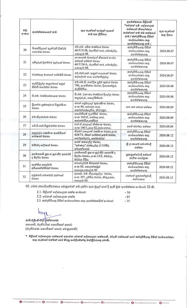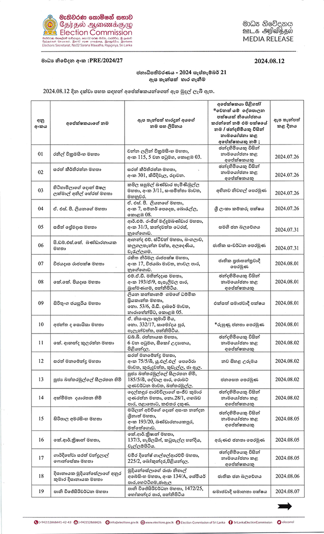 නිවේදනයක් නිකුත් කරමින් මැතිවරණ කොමිෂන් සභාවේ සභාපතිවරයා සඳහන් කර ඇත්තේ, පිළිගත් දේශපාලන පක්ෂ 16ක අපේක්ෂකයින් ජනාධිපතිවරණය සඳහා ඇප මුදල් තැන්පත් කර ඇති බවය.