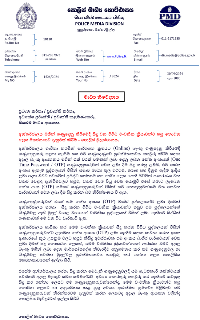 බැංකු විසින් එක්වරක් පමණක් ලබාදෙන මුරපද (OTP) කිසිදු හේතුවක් මත හුවමාරු කර නොගන්නා ලෙස පොලීසිය ජනතාවගෙන් ඉල්ලිමක් කරයි.