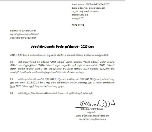 රජයේ නිලධාරීන්ට ලබන වසර සදහා රුපියල් 4000 කට නොවැඩි විශේෂ අත්තිකාරම් මුදලක් ගෙවීමට රජය තීරණය කර තිබෙනවා.