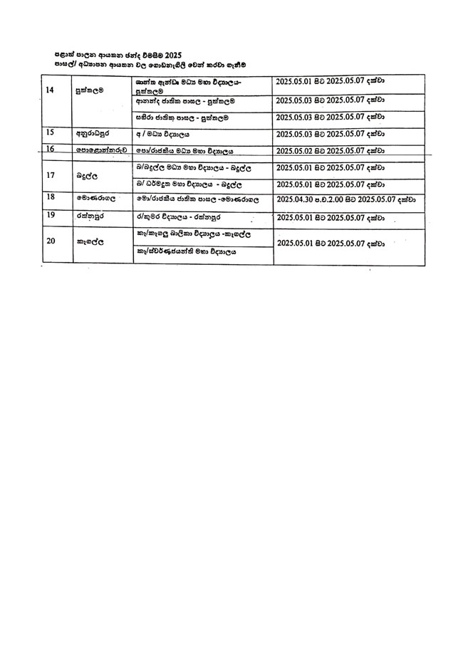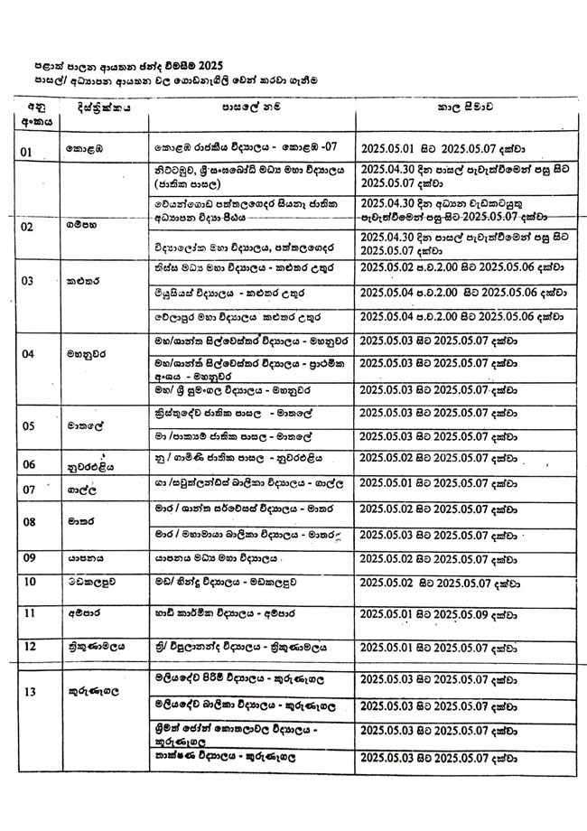 මැයි 7 වෙනිදා නිවාඩු ලැබෙන පාසල් මෙන්න