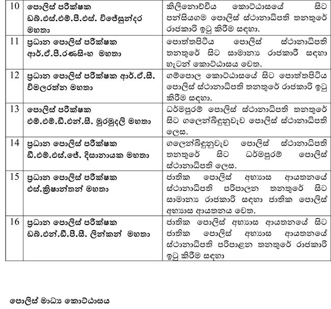ජාතික පොලිස් කොමිෂන් සභාවේ අනුමැතිය පිරිදි මෙම ස්ථානාධිපතිවරු වහාම ක්‍රියාත්මක වන පරිදි ස්ථාන මාරුවීම් හා පත්කිරීම් සිදුකර ඇත.