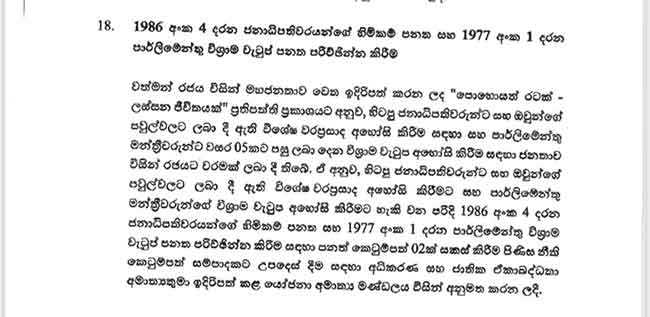 ඒ අනුව වත්මන් රජය විසින් ඉදිරිපත් කරන ලද ප්‍රතිපත්ති ප්‍රකාශයට අනුව, හිටපු ජනාධිපතිවරුන්ට සහ ඔවුන්ගේ පවුල්වලට ලබා දී ඇති විශේෂ වරප්‍රසාද අහෝසි කිරීමටත්, පාර්ලිමේන්තු මන්ත්‍රීවරුන්ට ලබා දෙන විශ්‍රාම වැටුප අහෝසි කිරීමටත් ජනතාව විසින් රජයට වරමක් ලබාදී ඇති බවයි අදාළ කැබිනට් තීරණයේ දැක්වෙන්නේ.ඒ සඳහා 1986 අංක 4 දරන ජනාධිපතිවරයන්ගේ හිමිකම් පනත සහ 1977 අංක 1 දරන පාර්ලිමේන්තු විශ්‍රාම වැටුප් පනත පරිච්ඡින්න කිරීම සඳහා පනත් කෙටුම්පත් 02ක් සකස් කිරීම පිණිස නීති කෙටුම්පත් සම්පාදකට උපදෙස් දීම සඳහා අධිකරණ සහ ජාතික ඒකාබද්ධතා අමාත්‍යවරයා ඉදිරිපත් කළ යෝජනා අමාත්‍ය මණ්ඩලය විසින් අනුමත කර ඇති බවයි වැඩිදුරටත් සඳහන් වෙන්නේ.