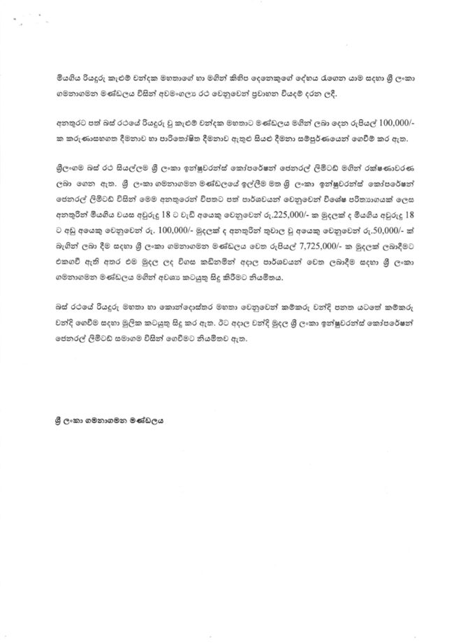 සියළුම ලංගම බස් රථ ශ්රී ලංකා රක්ෂණ සංස්ථාව (SLIC) යටතේ රක්ෂණය කර ඇති බැවින්, අනතුරින් මියගිය අවුරුදු 18ට වැඩි සෑම අයකුටම රුපියල් 225,000ක්ද, අවුරුදු 18 ට අඩු අයට රුපියල් 100,000ක්ද, තුවාල ලැබූ සෑම මගියෙකුටම රුපියල් 50,000ක් බැගින් ද ලබා දීමට එකඟ වී ඇති බවයි අදාළ වාර්තාවේ වැඩිදුරටත් දැක්වෙන්නේ.