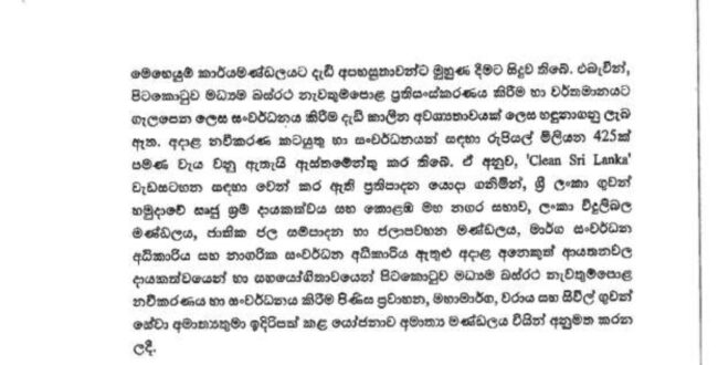අදාළ නවීකරණ කටයුතු හා සංවර්ධනයන් සඳහා ඇස්තමේන්තු කර ඇති මුදල රුපියල් මිලියන 425ක් වන අතර, ‘Clean Sri Lanka’ වැඩසටහන සඳහා වෙන් කර ඇති ප්රතිපාදන යොදා ගනිමින්, පිටකොටුව මධ්යම බස් රථ නැවතුම්පොළ ප්රතිසංස්කරණය කිරීමට නියමිත බවයි අදාළ කැබිනට් තීරණයේ දැක්වෙන්නේ.