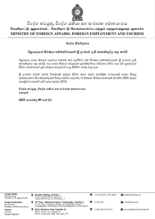 විදේශ කටයුතු, විදේශ රැකියා සහ සංචාරක අමාත්‍යාංශය විසින් නිකුත්කළ නිවේදනය,