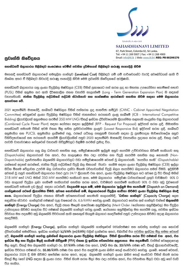 සහස්ධනවි බලාගාරය සමතුලිත ගාස්තුව පිළිබඳව පැතිර යන ප්‍රචාර සම්බන්ධයෙන් එම ආයතනය කරුණු පැහැදිලි කරමින් මාධ්‍ය නිවේදනයක් නිකුත් කර තිබේ.