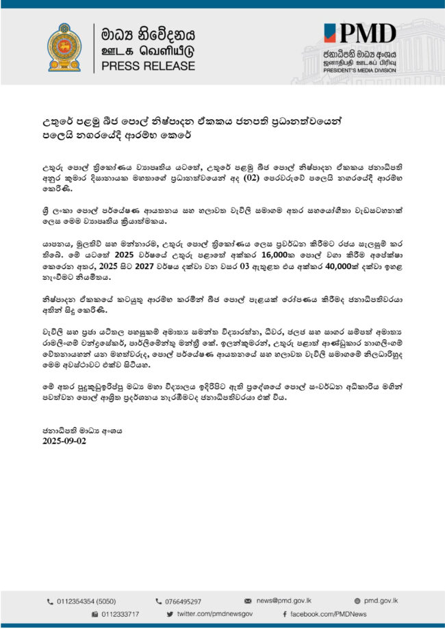 උතුරු පොල් ත්‍රිකෝණය ව්‍යාපෘතිය යටතේ, උතුරේ පළමු බීජ පොල් නිෂ්පාදන ඒකකය ජනාධිපති අනුර කුමාර දිසානායකගේ ප්‍රධානත්වයෙන් අද (02) පෙරවරුවේ පලෙයි නගරයේදී ආරම්භ කර තිබෙනවා.