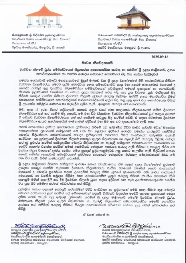 දියවඩන නිලමේ ධුරය සම්බන්ධයෙන් සිදුකෙරන අපහාසාත්මක සංවාද හා එමගින් ශ්රී දළදා මාළිගාවේ, උභය මහා විහාරයන්ගේ හා සමස්ත බෞද්ධ සමාජයේ ගෞරවයට සිදු වන හානිය පිළිබඳව දැනුවත් කරමින් මල්වතු – අස්ගිරි මහානා හිමිවරුන් විසින් නිවේදනයක් නිකුත් කර තිබේ.