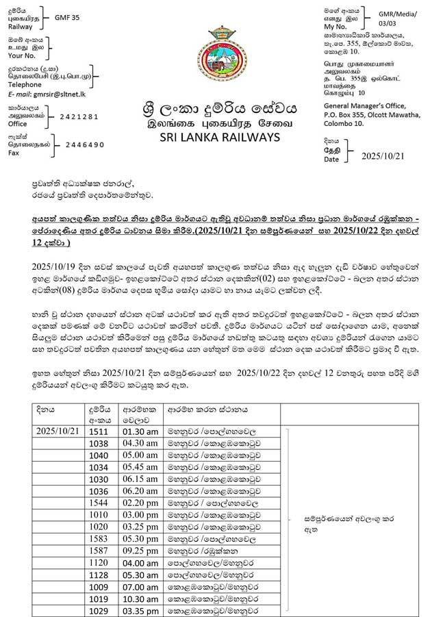එමෙන්ම හෙට දහවල් 12 වන තුරුද පහත පරිදි දුම්රිය ගමන් වාර අවලංගු කිරීමට සිදුව ඇති බව දැනුම් දී තිබේ.