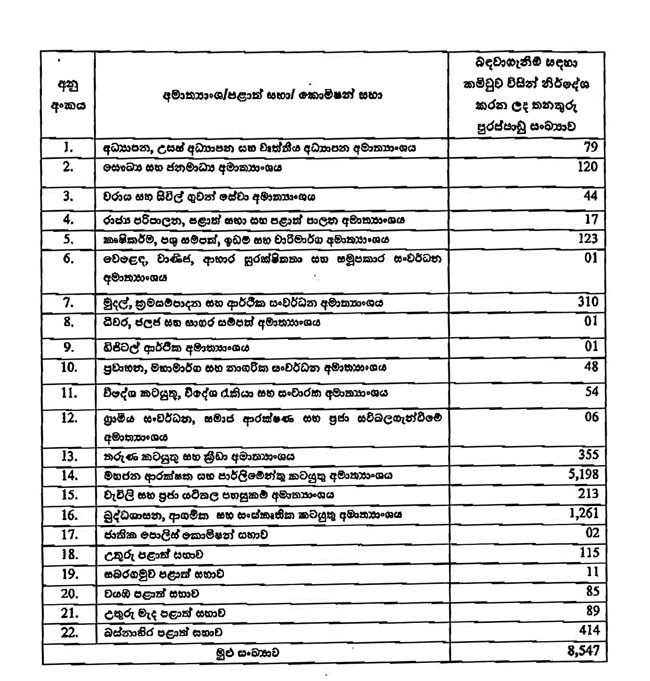 ඒ අනුව ඒ ඒ අමාත්‍යාංශ විසින් එම අමාත්‍යාංශ යටතේ පවතින දෙපාර්තමේන්තු සහ අනෙකුත් ආයතනවල පවතින තනතුරු පුරප්පාඩු සම්පූර්ණ කිරීම සඳහා ඉදිරිපත් කරන ලද ඉල්ලීම් සැලකිල්ලට ගෙන, ඔක්තෝබර් 02 වන දින පැවති අමාත්‍ය මණ්ඩල රැස්වීමේ දී කරනු ලැබ ඇති නිර්දේශ පරිදි පහත සඳහන් බඳවාගැනීම් සිදුකිරීම සඳහා අදාළ අමාත්‍යාංශ සහ ආයතන වෙත අනුමැතිය ලබාදී ඇත.