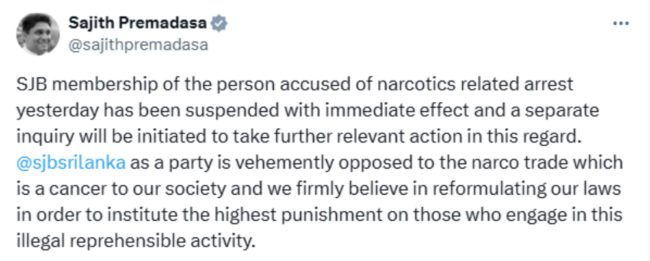 මත්ද්රව්ය චෝදනාවට අත්අඩංගුවට ගත් සජබ හිටපු ප්රා. සභා මන්ත්රීගේ පක්ෂ සාමාජිකත්වය අත්හිටුවයි