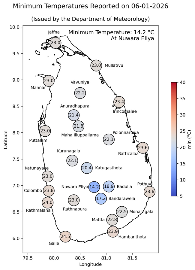 අද (06) දිනයේ, දිවයිනේ අවම උෂ්ණත්වය සෙල්සියස් අංශක 14.2 ක් ලෙස නුවරඑළිය කාලගුණ මධ්යස්ථානයෙන් වාර්තා වී ඇති බව කාලගුණ විද්යා දෙපාර්තමේන්තුව පවසයි.