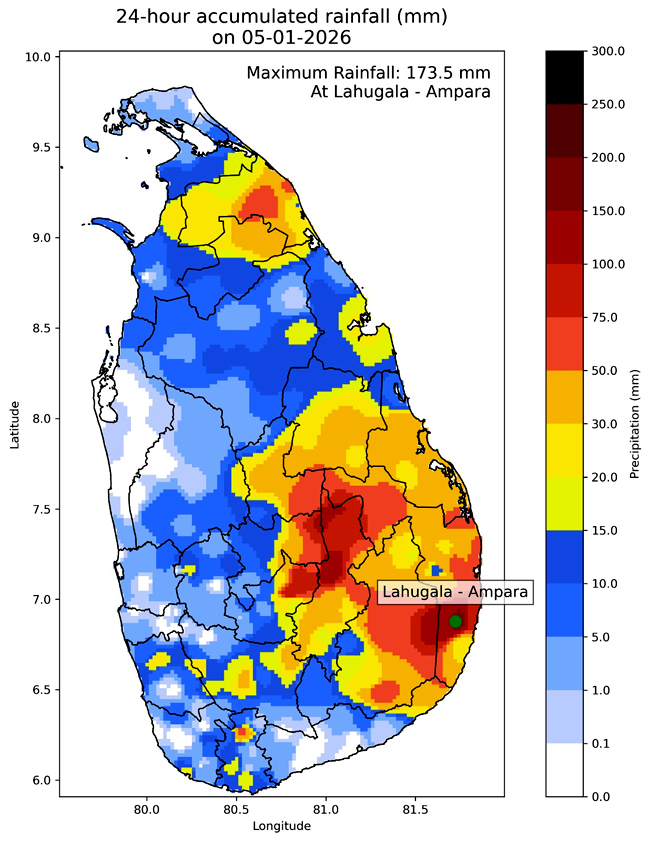 එමෙන්ම ඊයේ (05) දිනයේ උපරිම වර්ෂාපතනය මි. මී 173.5 ක් අම්පාර දිස්ත්රික්කයේ ලාහුගල ප්රදේශයෙන් වාර්තා වී ඇති බව දැනුම් දී ඇත.