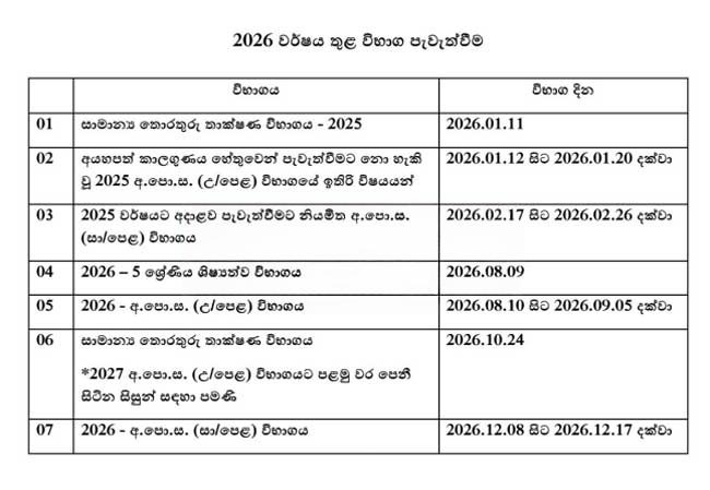 ඒ අනුව 2026 වසර සඳහා ජාතික විභාග 7ක් පැවැත්වීමට නියමිතය.