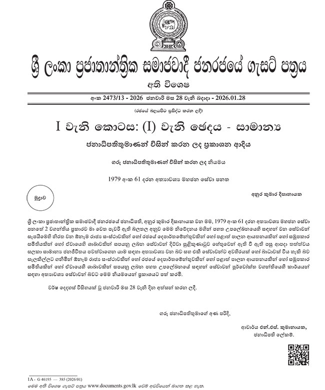 1979 අංක 61 දරන අත්යාවශ්ය මහජන සේවා පනතේ 2 වගන්තිය ප්රකාරව ශ්රී ලංකා ප්රජාතාන්ත්රික සමාජවාදී ජනරජයේ ජනාධිපති, අනුර කුමාර දිසානායක මහතා වෙත පැවරී ඇති බලතල අනුව මෙම අති විශේෂ ගැසට් නිවේදනය නිකුත්කර තිබේ.