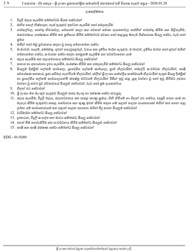 දිට්වා සුළිකුණාටුව හේතුවෙන් ඇතිවූ පසු ආපදා තත්ත්වය සලකා සාමාන්ය ජනජිවිතය පවත්වා ගෙන යාම සඳහා අත්යාවශ්ය වන බව සහ එකී සේවාවන්ට අවහිරයක් හෝ බාධාවක් විය හැකි බව සැලකිල්ලට ගනිමින් පහත උපලේඛනයේ සඳහන් සේවාවන් අත්යාවශ්ය සේවාවන් බවට මෙම නියමයෙන් ප්රකාශයට පත්කර ඇත.