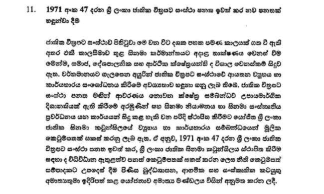 1971 අංක 47 දරන ශ්‍රී ලංකා ජාතික චිත්‍රපට සංස්ථා පනත ඉවත් කර නව පනතක් හඳුන්වා දීමට කැබිනට් අනුමැතිය හිමිව තිබෙනවා.